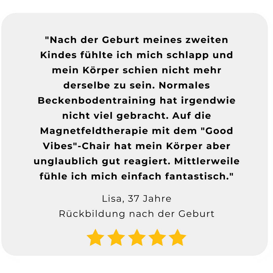 Die Good Vibes Beckenbodenstühle nutzen fortschrittliche Magnetfeldtherapie, um tief liegende Muskeln zu aktivieren – effizienter als herkömmliches Training. In einer entspannten Atmosphäre und mit persönlicher Betreuung sorgen wir dafür, dass jede Trainingseinheit perfekt auf dich abgestimmt ist.